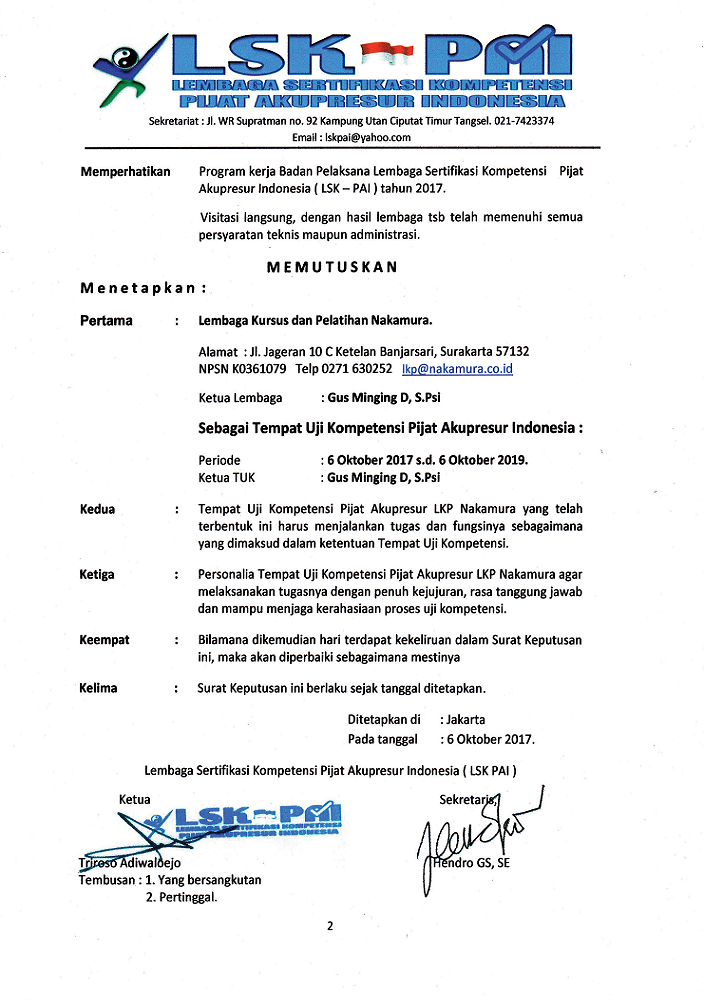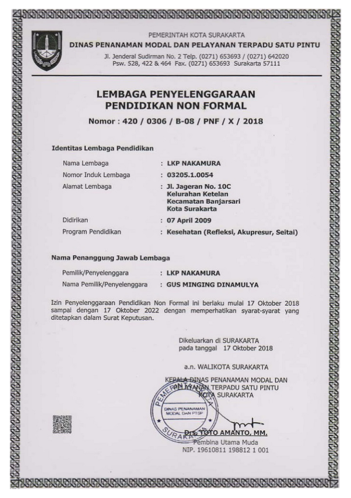 LPK Nakamura merupakan Lembaga pelatihan kerja yang sudah terakreditasi oleh BAN PAUD dan PNF serta terakreditasi oleh LA-LPK. LPK Nakamura memperoleh Juara 2 dalam program Apresiasi Lembaga Kursus dan Pelatihan Kategori: Vokasional dari Dinas Pendidikan Anak Usia Dini Provinsi Jawa Tengah. LPK Nakamura mempersiapkan tenaga yang handal dan kompeten di bidang refleksi, soft skill serta bahasa Jepang. Metode yang kami gunakan saat ini yaitu berbasis offline maupun online.
