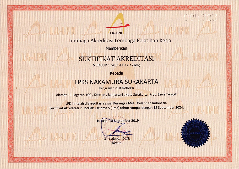 LPK Nakamura merupakan Lembaga pelatihan kerja yang sudah terakreditasi oleh BAN PAUD dan PNF serta terakreditasi oleh LA-LPK. LPK Nakamura memperoleh Juara 2 dalam program Apresiasi Lembaga Kursus dan Pelatihan Kategori: Vokasional dari Dinas Pendidikan Anak Usia Dini Provinsi Jawa Tengah. LPK Nakamura mempersiapkan tenaga yang handal dan kompeten di bidang refleksi, soft skill serta bahasa Jepang. Metode yang kami gunakan saat ini yaitu berbasis offline maupun online.